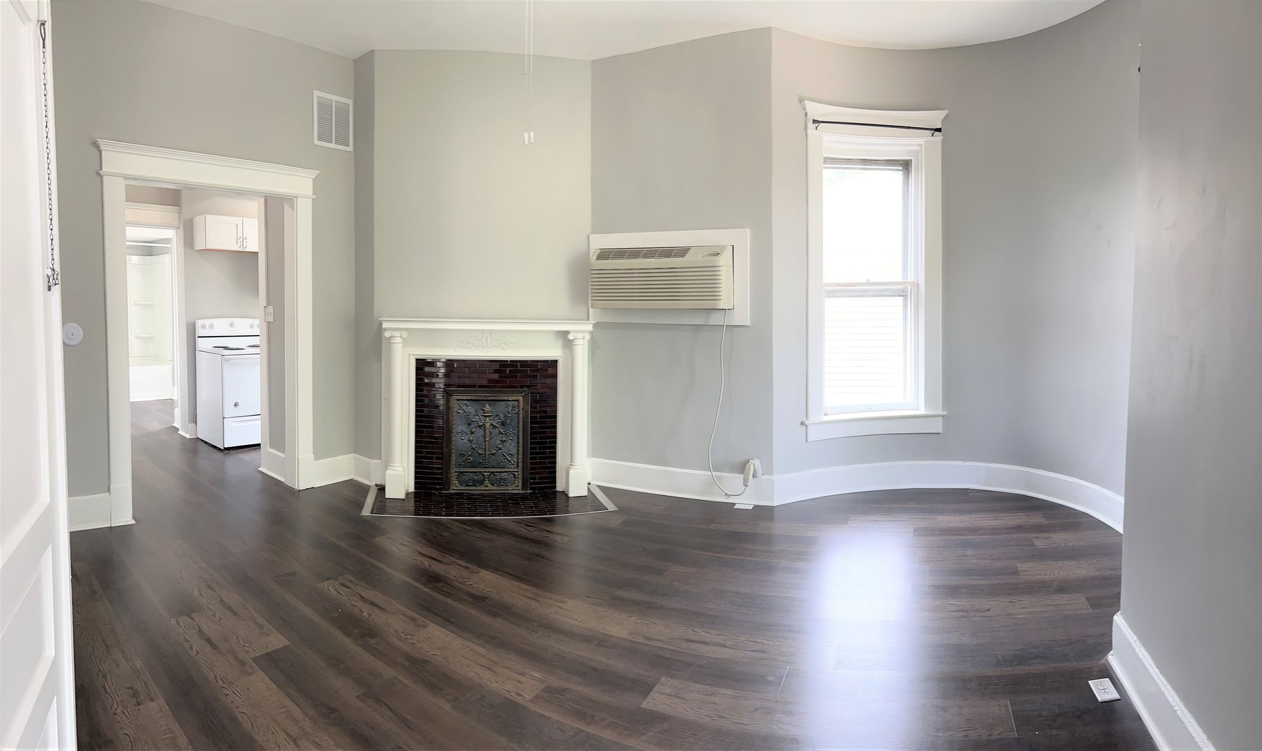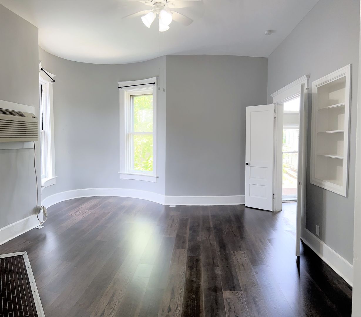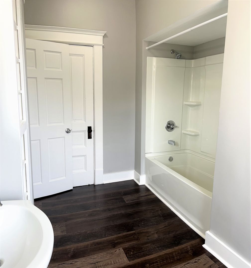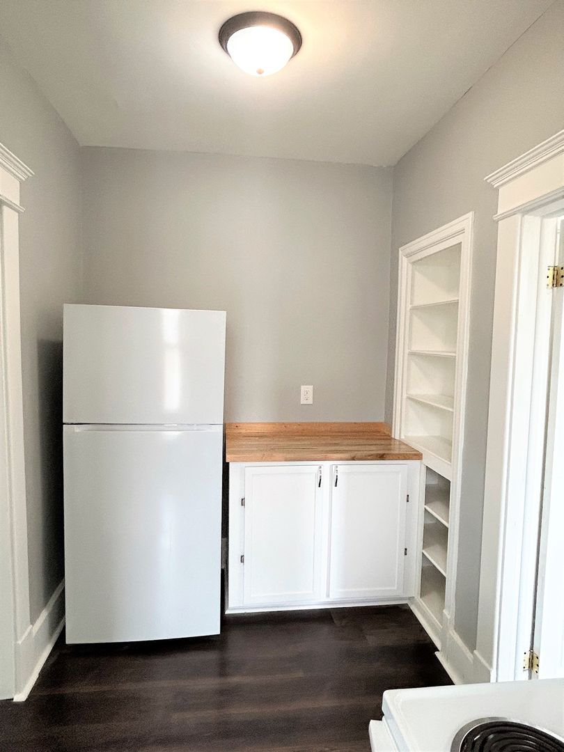 This Apartment features a decorative fireplace, built in shelving, Luxury Vinyl Plank Flooring, French doors on the bedroom, and a beautifully unique living room with a Bay Window .The bathroom has a bath/shower combo as well as a built in linen cabinet.