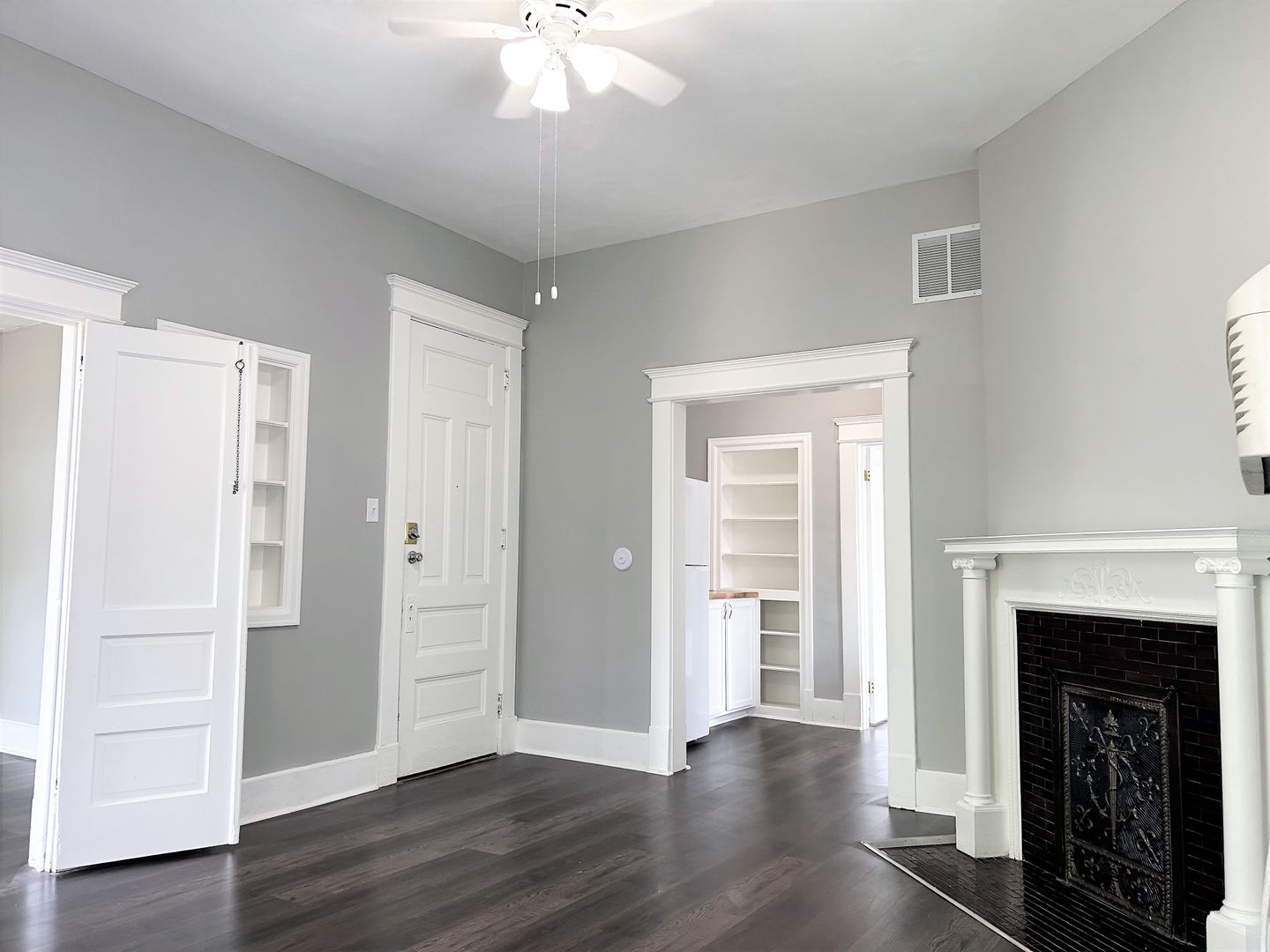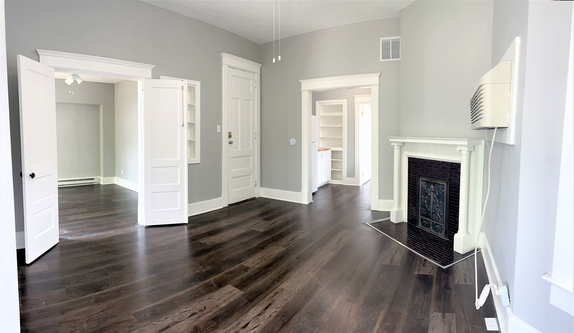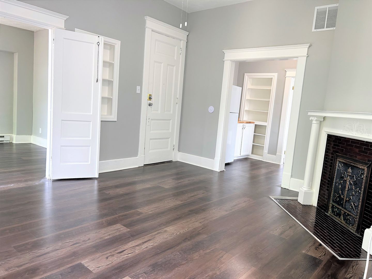 This Apartment features a decorative fireplace, built in shelving, Luxury Vinyl Plank Flooring, French doors on the bedroom, and a beautifully unique living room with a Bay Window .The bathroom has a bath/shower combo as well as a built in linen cabinet.