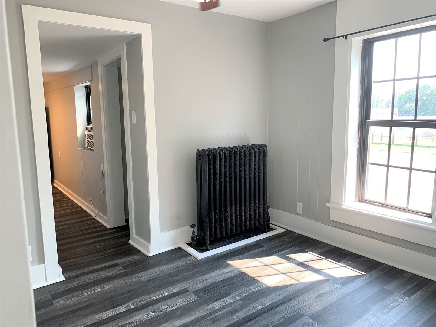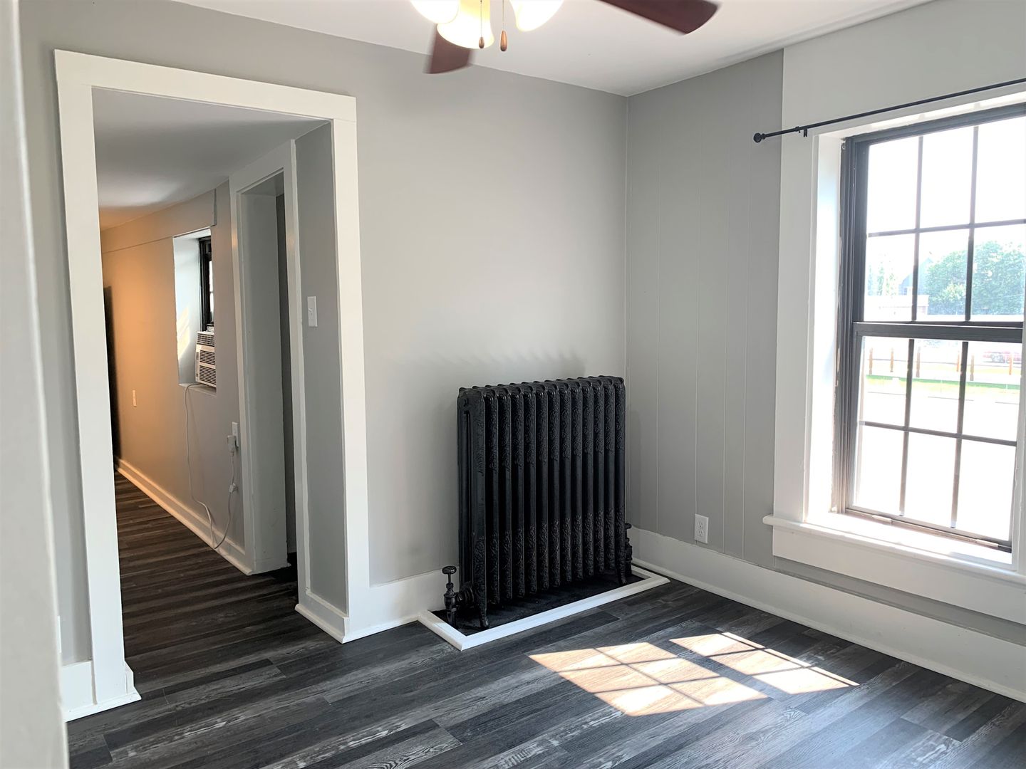 This apartment has a boiler heat system, and a window ac unit.
