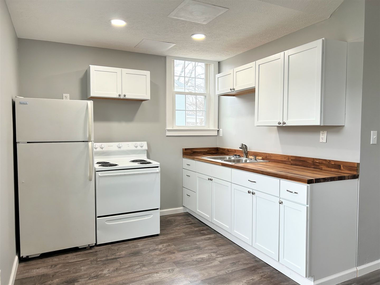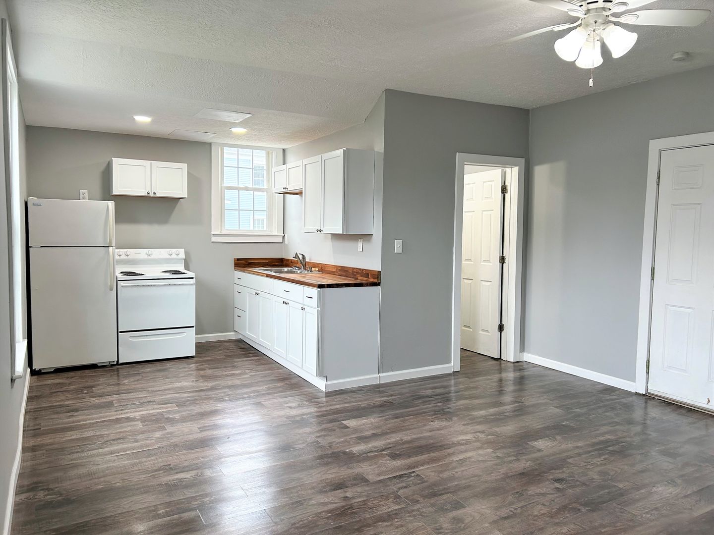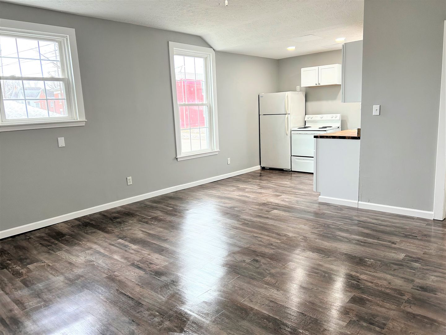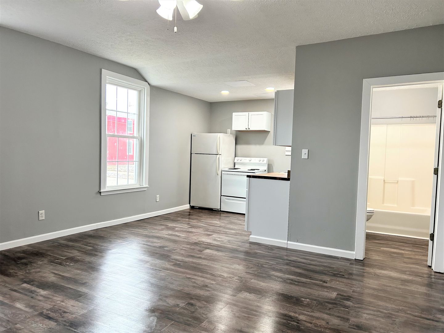 This Apartment is on the 1st floor with an open concept kitchen/living room, the bathroom has a bath/shower combo, newer windows, Refrigerator/stove are provided.