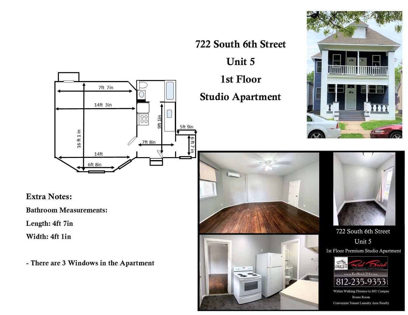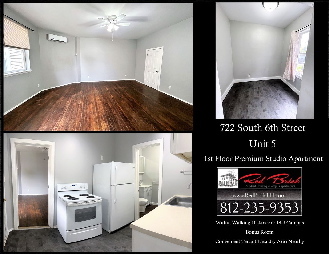Within Walking distance to ISU Campus and Downtown Terre Haute, This Premium Studio Apartment at 722 South 6th Street Unit 5 Features a Private Entrance, The Main living area is Spacious, plus an Bonus room was built in off the kitchen for added space! (Great for a small bedroom, Office, or study area. The apartment also has Vinyl Plank Flooring in the Kitchen, Bonus Room, and Bathroom, Hard Wood flooring in the Main Living Area. Bath/Shower Combo in the Bathroom. On and Off Street Parking Available