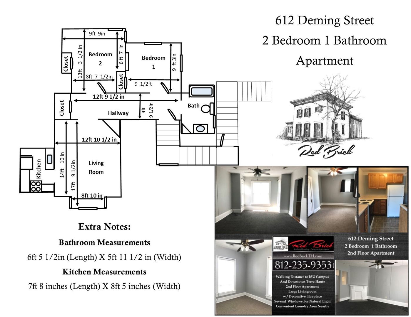 Now Accepting Applications for a 2nd floor 2 Bedroom 1 Bathroom Apartment at 612 Deming Street Within walking distance to ISU Campus and downtown Terre Haute